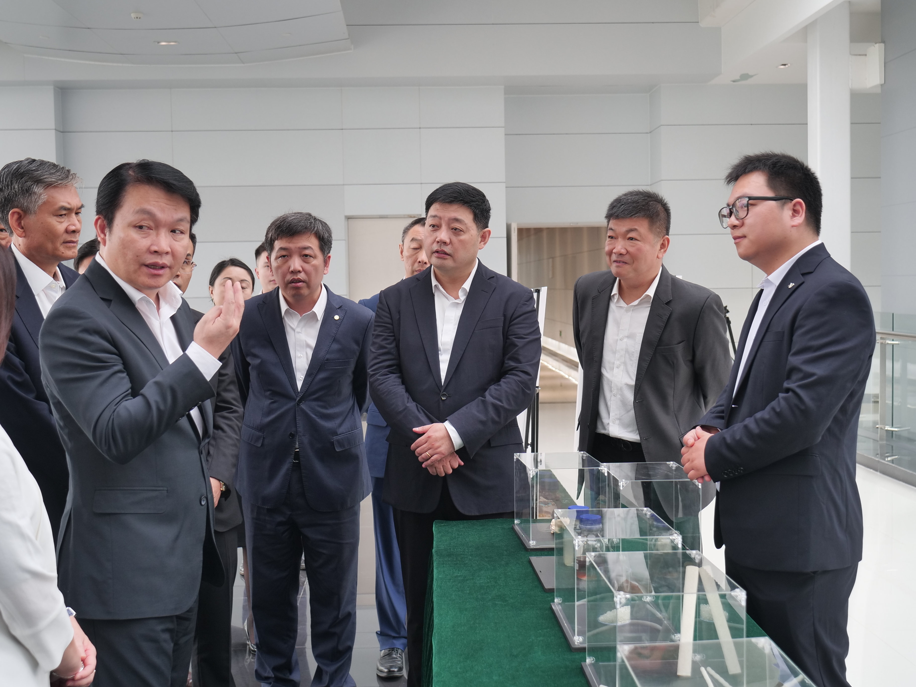 11点30分,刚刚参加完粤澳合作中医药科技产业园开工仪式的领导在裕新贝隆联合创始人、总经理陈亮的引领下,前往位于产业园内RD8号楼3楼的裕新贝隆公司进行参观考察。